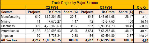 This headline gain in fresh investment in Q3/FY26 was largely shaped by a sharp sectoral divergence. Of the five major sectors, while the Infrastructure and Irrigation sectors expanded strongly, the Manufacturing and Electricity sectors fared badly.